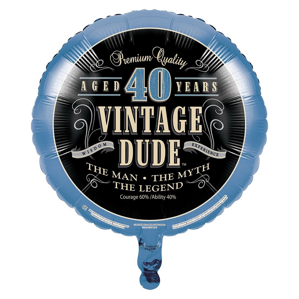 Vintage Dude 40th : The birthday guy has reached the pinnacle of perfection, so celebrate with our Vintage Dude 40th Birthday Balloon! This mylar balloon features "Vintage Dude" along with "Aged 40 Years" printed in ivory letters against a black background with a blue border. The Vintage Dude 40th Birthday Balloon is sold individually. The Vintage Dude 40th Birthday Mylar Balloon makes set up easy, and clean up a breeze! Gender: unisex.
