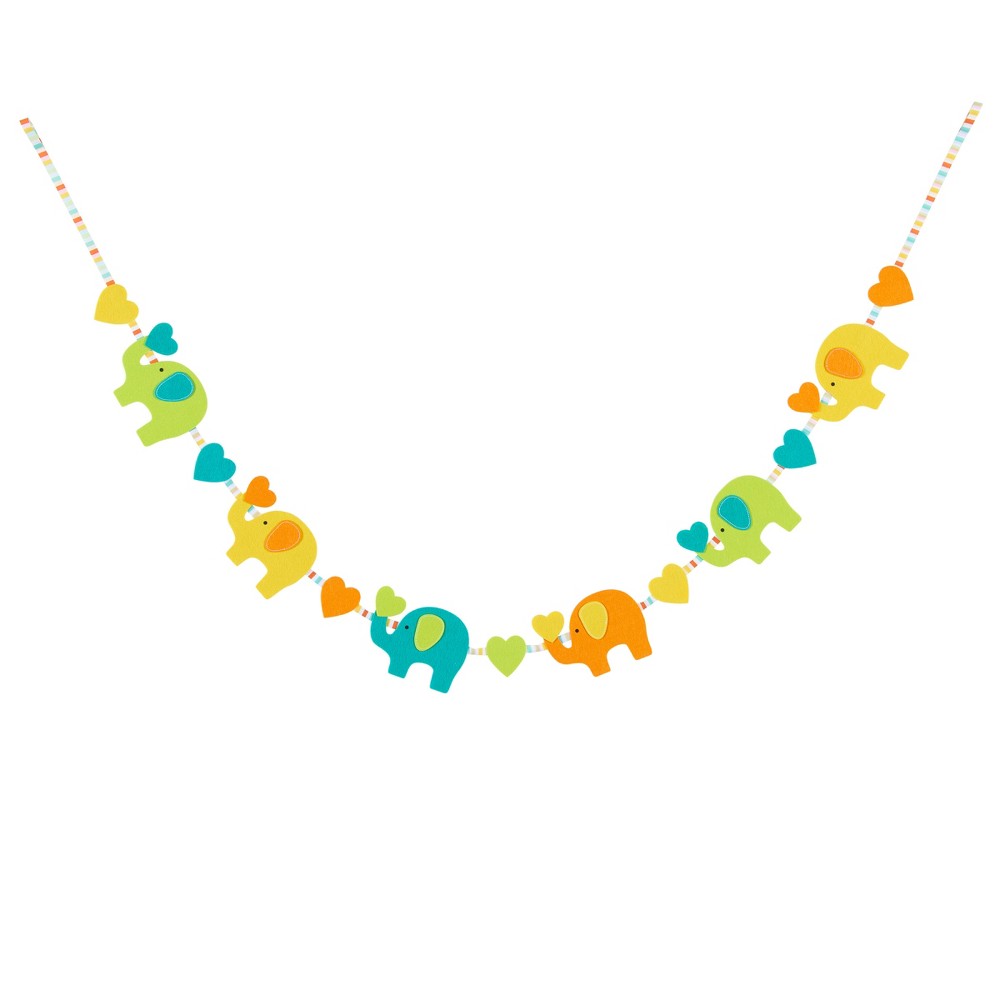 Celebrate the happy day with this adorable banner from Papyrus featuring bright felt elephants and hearts in a row. Perfect for baby showers or any baby celebration. Finished with stitching and striped grosgrain ribbon for hanging. Coordinates with the Happy Day collection.