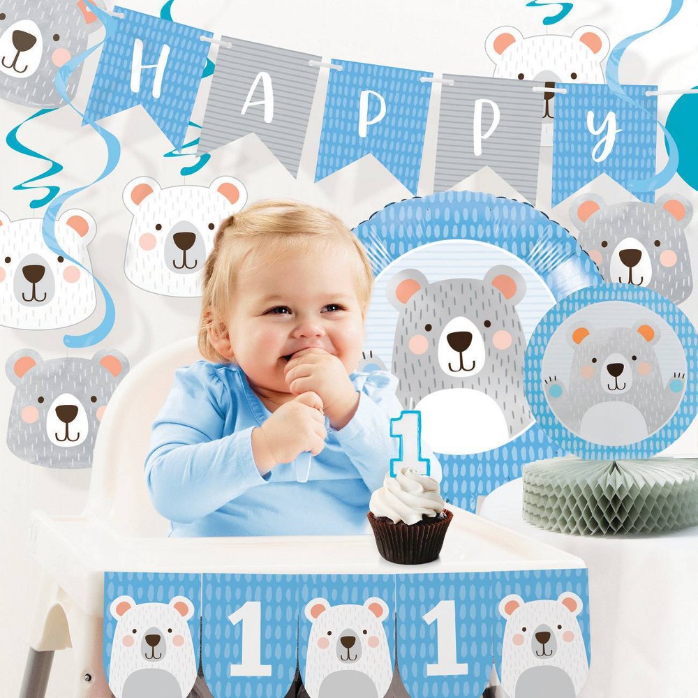 1st Birthday Bear : Each Bear Party 1st Birthday Decorations Kit contains: 1 Bear Party Happy Birthday Banner with Sticker (76" x 6"), 5 Bear Party Dizzy Danglers ((2) 39" (3) 30"), 1 Bear Party Centerpiece (9" x 12"), and 1 Bear Party Mylar Balloon (18"), 1 Bear Party 1st Birthday High Chair Kit (Banner - 3.5" x 21" Plastic Floor Mat - 30" x 48"), and 1 Blue 1st Birthday Candle (1.5" x 2.5"). Decorate your child's bear-themed first birthday party with these "beary" adorable decorations! Party decor features bears in a gray and blue color palette. Kit contains items for celebrating the one-year-old, including a high chair kit that's perfect for capturing smash cake photos. This kit coordinates with our other bear party supplies.