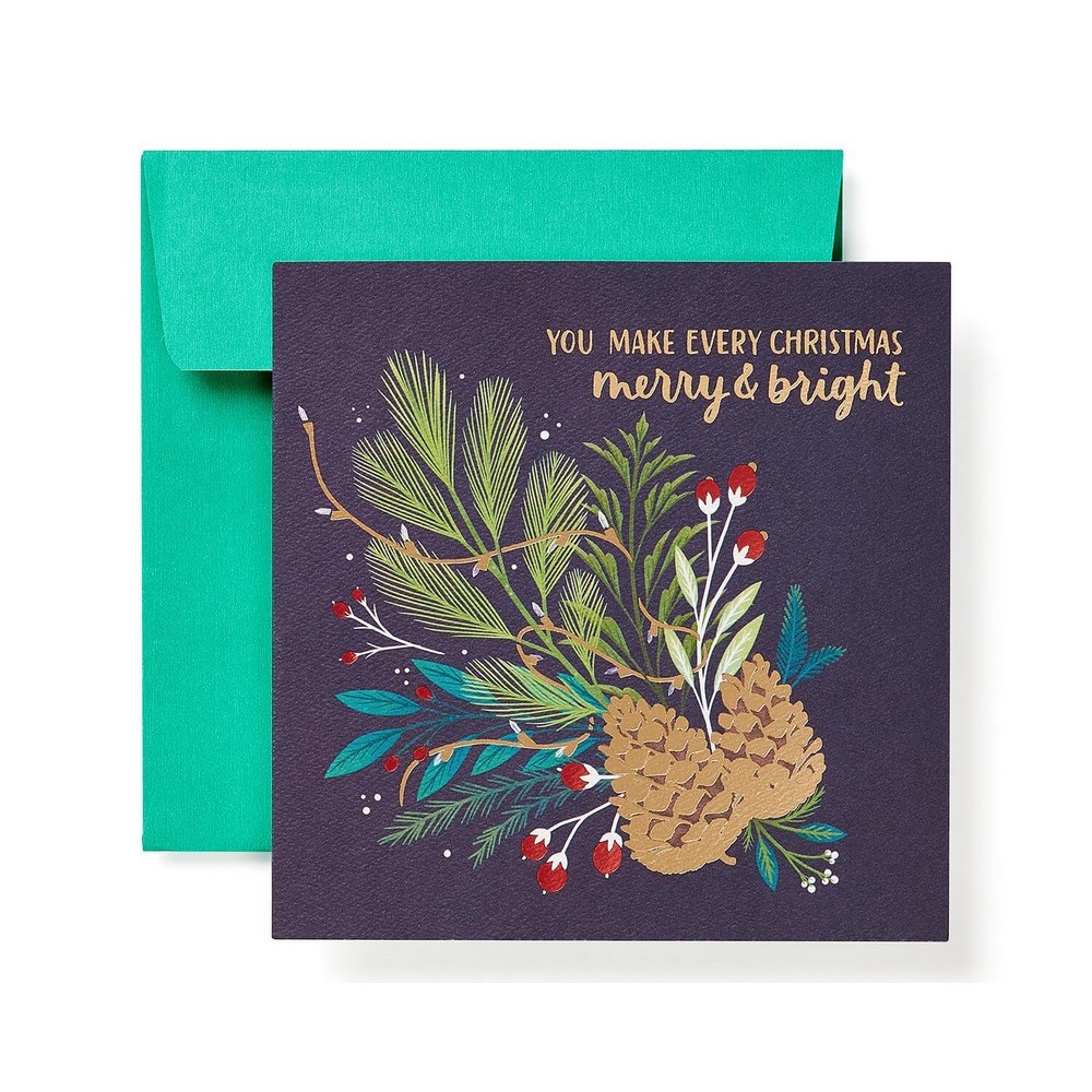 Make their holidays shine bright! From American Greetings, Present Company Christmas cards help you fit meaning into your very full life, especially during the holidays! This beautifully designed greeting card wraps a Merry Christmas wish with warm words of gratitude perfect for parents, mom, dad and a friend! A wintery bouquet of pinecones, evergreen branches, holly berries and mistletoe decorates the inside and outside of the card, along with shimmering red and gold foil details. Thick, cotton-blend paper stock with a textured surface adds a quality feel. Affix the unique envelope seal for a bonus message! With so many amazing people in your life, Christmas is the perfect time to celebrate them all. Present Company included! Pattern: Shapes.