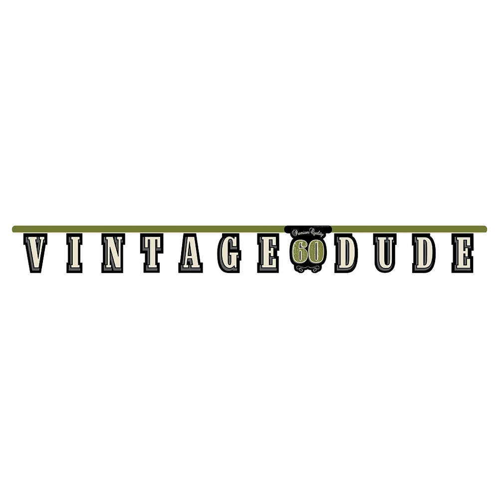 Vintage Dude 60th : The man of the hour is in the prime of his life, so make a big statement at his 60th birthday with the Vintage Dude 60th Birthday Banner. This hanging decoration measures 9.25' long and features cardstock letter cutouts that spell out "VINTAGE DUDE" in gray, black and green letters. Coordinate this festive banner with other Vintage Dude decorations for a complete setup. Pattern: Numbers.
