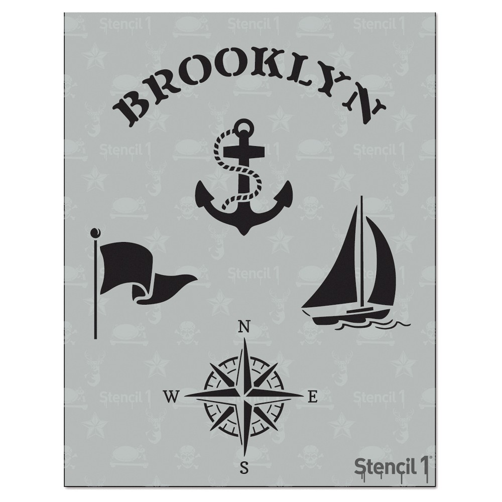 Stencil1 Brooklyn Nautical Multipack 5ct - Stencil : This Stencil1 Brooklyn Nautical Mini Set stencil gives you a variety of nautical images, cut on one sheet, including an anchor, sailboat, compass, flag and Brooklyn typography. Perfect for that sailor life. Made of mylar, this stencil is washable, reusable and compatible with paints, inks, markers, pencils and more. Can be applied to a variety of materials, including wood, paper, fabric, metal, ceramic, concrete and glass. Show us how you create with Stencil1 by tagging #stencil1 for a chance to be featured on Stencil1.com.