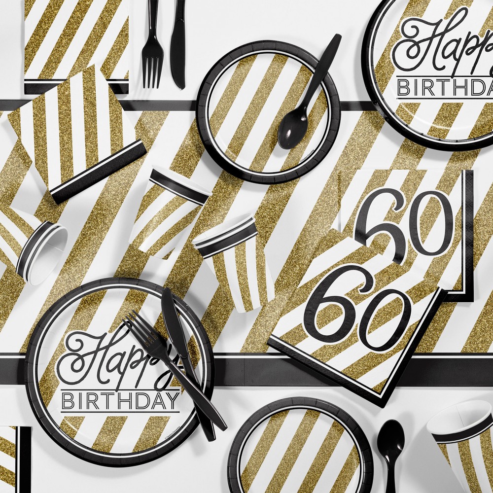 Each Black and Gold 60th Birthday Party Supplies Kit contains: 8 Black and Gold Paper Plates (9"), 8 Black and Gold Dessert Plates (7"), 16 Black and Gold 60th Birthday Napkins (6.5"), 16 Black and Gold Beverage Napkins (5"), 8 Black and Gold Cups (9oz), 1 Black and Gold Plastic Tablecloth (54" x 102"), and 8 Black forks, spoons, and knives. You know what they say: go glam or go home! Our Black and Gold Birthday Party Supplies feature a chic gold glitter, white, and black stripe design with stylish "happy birthday" typography. The napkins feature a "60" to recognize the guest of honor's age. Use this kit in coordination with our other Black and Gold Birthday Party Supplies.