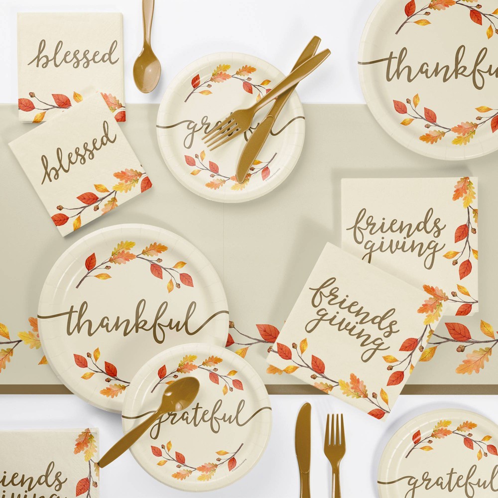 Thankful Friendsgiving Party Supplies Kit : Each Thankful Friendsgiving Party Supplies Kit contains: 8 Thankful Paper Plates (9"), 8 Thankful Dessert Plates (7"), 16 Thankful Friendsgiving Napkins (6.5"), 16 Thankful Cocktail Napkins (5"), 1 Thankful Plastic Tablecloth (54" x 102"), and 8 Glittering Gold Forks, Spoons, and Knives. Set a simple-yet-stylish Friendsgiving table with help from our Thankful Friendsgiving Party Supplies Kit. This kit includes Friendsgiving party supplies for serving a meal to up to eight guests. The party supplies in this kit feature sprigs of fall leaves and simple typography of words like, "blessed," "thankful," and "grateful." The "friendsgiving" napkins make this kit perfect for celebrating Thanksgiving with friends. Select this kit and begin planning your Friendsgiving celebration!