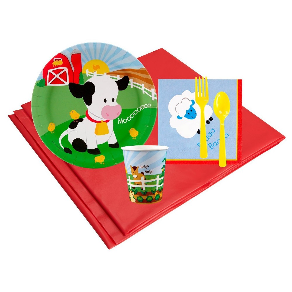 Barnyard 8 Guest Party Pk : Barnyard 8 Guest Party Pack includes 8 dinner plates, cups, forks, spoons, 20 lunch napkins, 1 solid table cloth. Size: 8 Guest Pk.