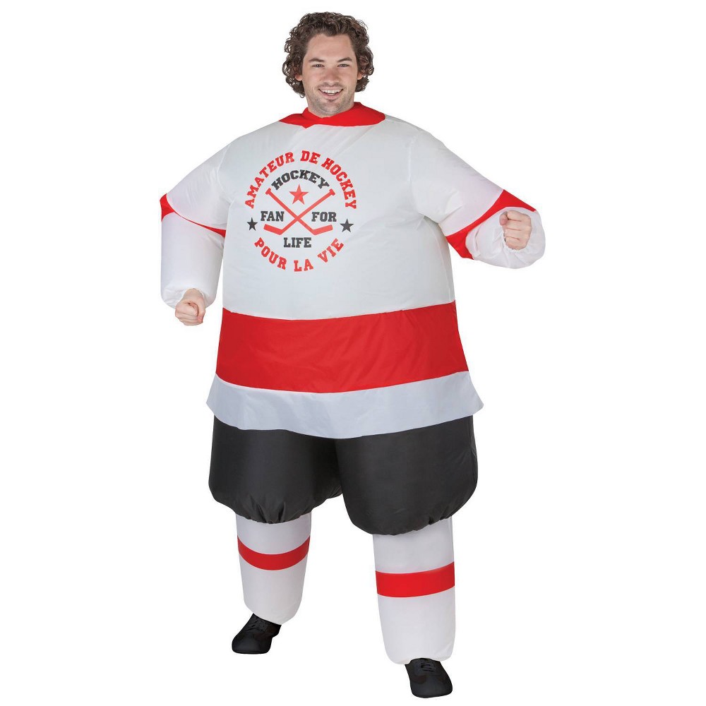 The Hockey Player Adult Inflatable Costume is the perfect costume for Hockey fans! This inflatable costume comes with the words "Hockey Fan for Life" printed on the jersey. It comes with an inbuilt fan that keeps the costume inflated, and cushions you from falls or hits. Made of polyester, this costume can be spot or wiped clean. Hockey sticks at the ready? Let's play! Gender: 0482Men. Pattern: printed/spot. Material: jersey/polyester.