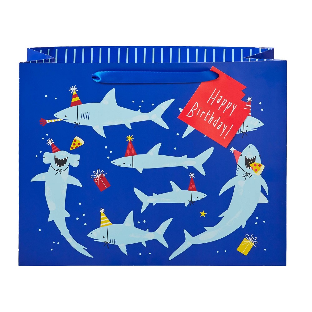 Pack gifts for the birthday person in the Large Shark Party Gift Bag from Spritz. This blue paper bag has a caricature of different sharks getting together to celebrate that young kids'll love. It also sports a neat little message that reads, "Happy birthday". Pack gifts and trinkets in this bag to make their special day a memorable one.
