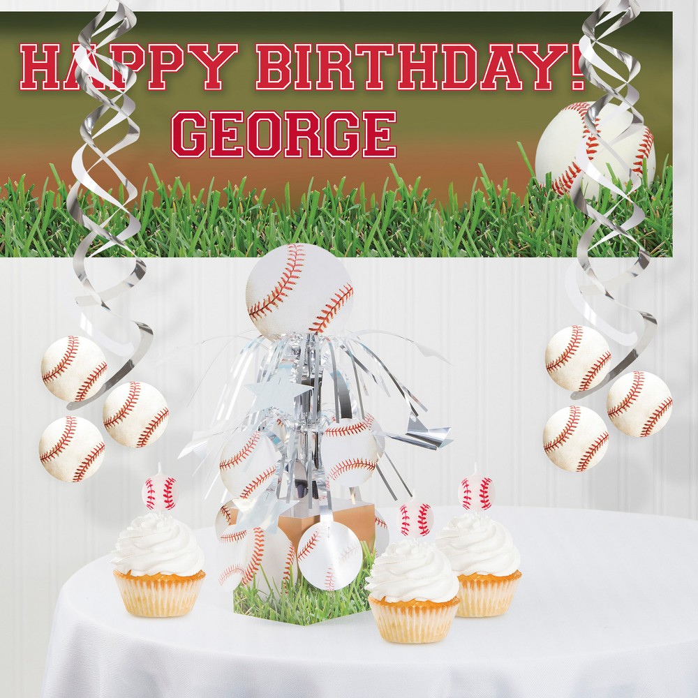 Baseball Decoration Party Kit Green/Red/White : Each Baseball Decorations Kit contains: 1 Baseball Giant Party Banner (20" x 60"), 2 Baseball Deluxe Danglers (36"), 1 Baseball Centerpiece (4" x 13.5"), and 4 Baseball Pick Candles (3"). Hit a home run when you use this Baseball Decorations Kit for your next baseball-themed celebration. The baseball field and ball design is perfect for birthday parties, team celebrations, or game viewing parties. When you use the included hanging and tabletop decorations, pulling the party together is simple. Use this kit in coordination with our other baseball party supplies.