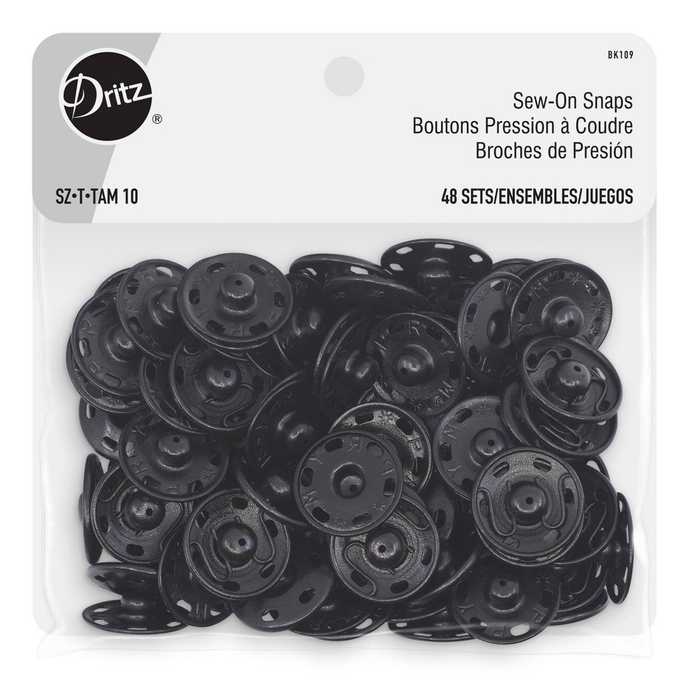 Dritz 48ct Size 10 : Dritz Sew-On Snaps are flat closures used to hold overlapping edges of fabric together and are ideal for use on clothing and accessories. These brass snaps have been specially crafted for durability and toughness and include six openings on the edges for stitching. Use them as garment closures on cardigans, coats and other apparel.
